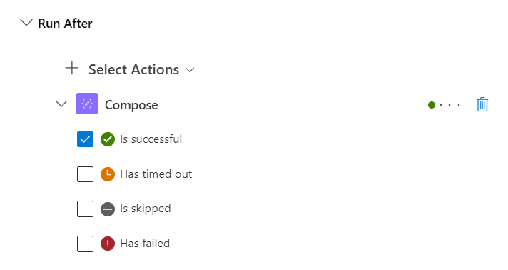- Is skipped: This means that selected action should only run if previous action is skipped.