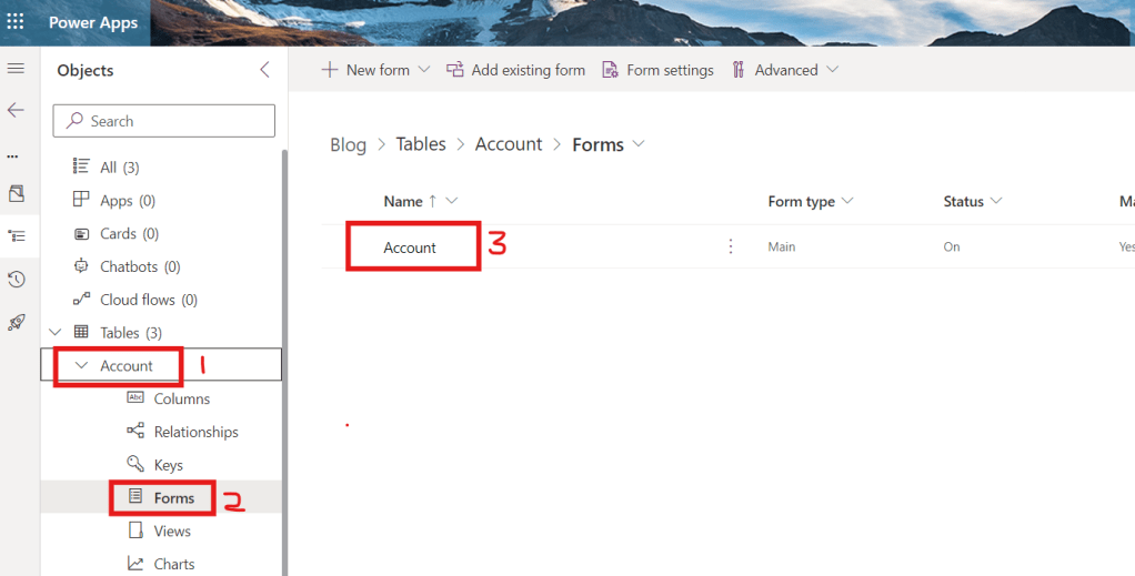 - Navigate to https://make.powerapps.com/ and select your solution >> Account entity >> Forms >> Account Form