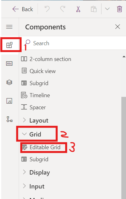 - From the left navigation, select Components >> expand Grid >> select Editable Grid (Add this editable in a new tab)