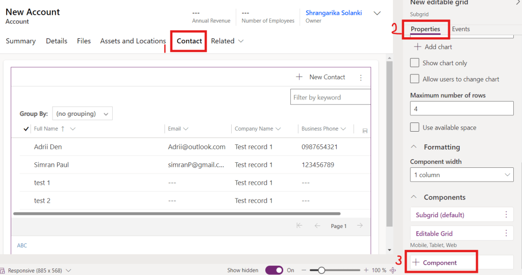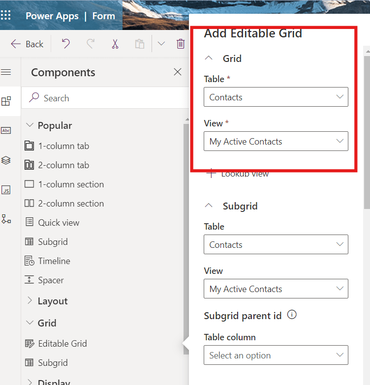- For that, select Contacts subgrid then from properties pane click on +Components.