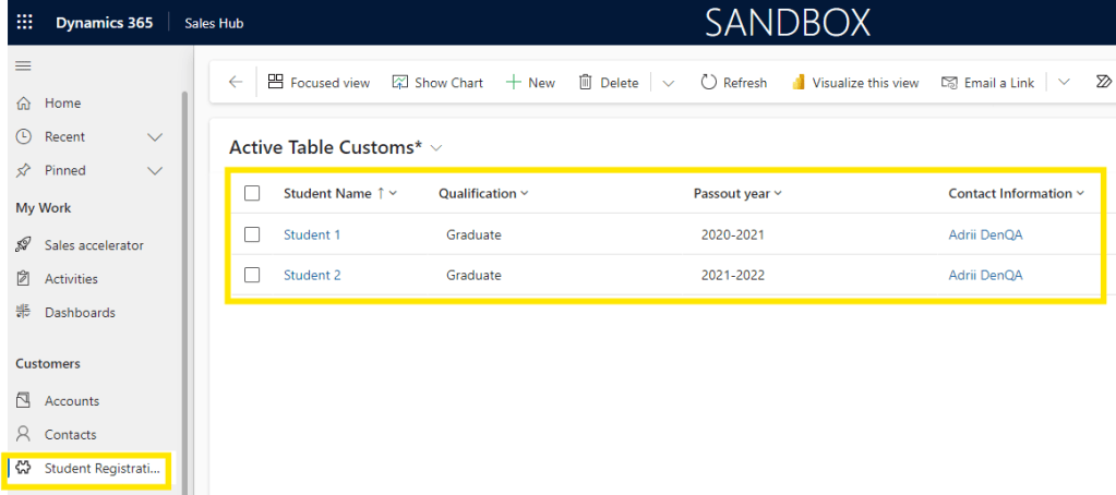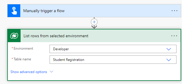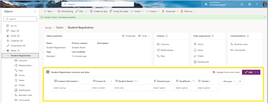 - Select “Developer” as environment and “Student Registration” as Table name as shown below.