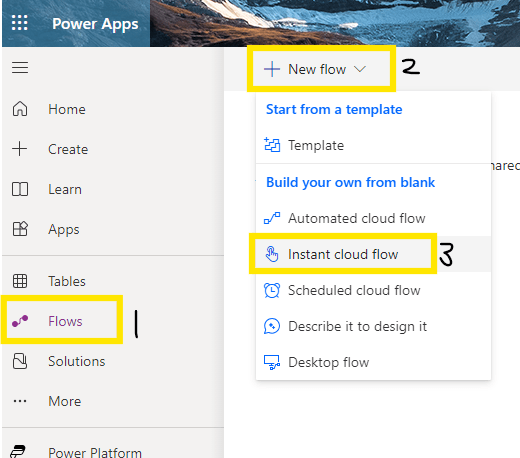 - Select “Flows” from left navigation then select “+New Flow” >> Instant Cloud Flow