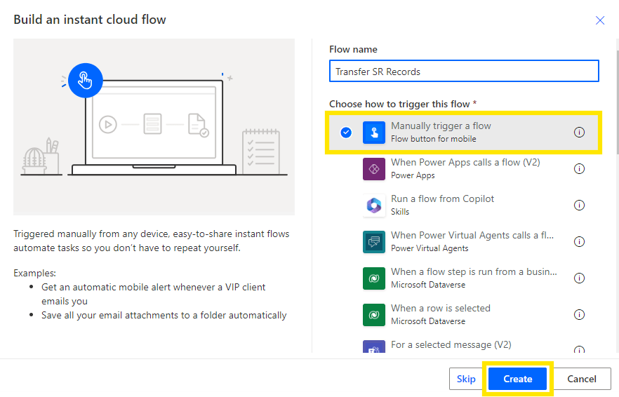 - Give name to your flow, select manually trigger a flow and then click on “Create” button.