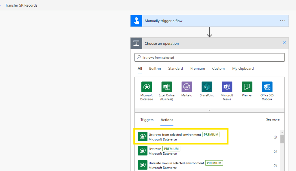 - Now, add a new action “List rows from selected environment”.