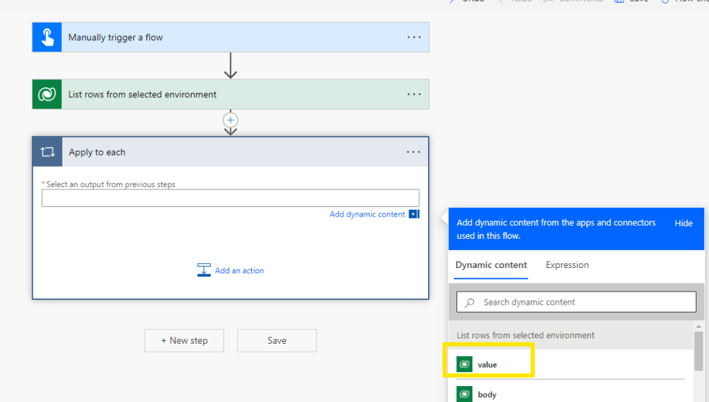 - Add an “Apply to each” control and select the “Value” property from the “List rows from selected records” action as illustrated below.