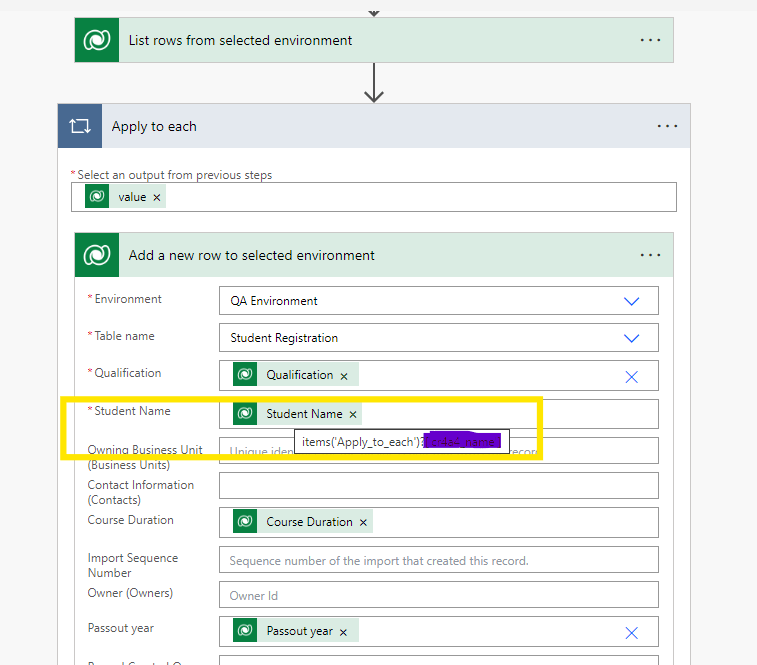 - Next, within the “Apply to each” action, add the “Add a new row to selected environment” action and specify the environment name (e.g. QA environment) and table name (e.g. Student Registration) and set the dynamic content from Apply to each in all the required columns from above step. (e.g. Student Name as Student Name)