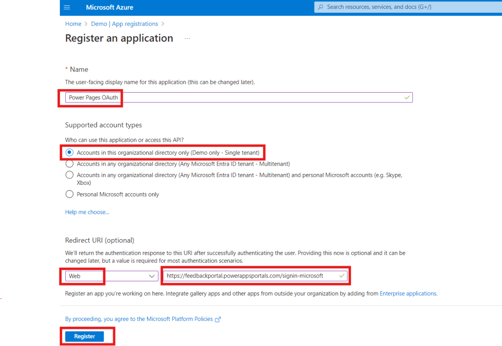 - Who can use this application or access this API? – Select any option as per your need. Here, I am selecting for “Accounts in this organizational directory only (Demo only – Single tenant)”.