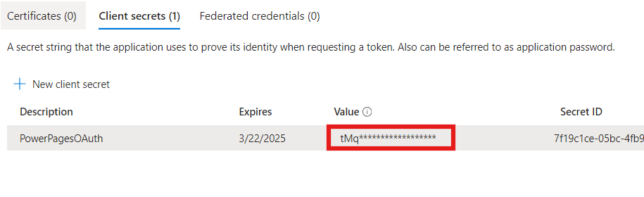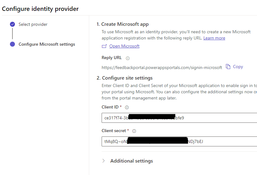 - Configure Microsoft Identity Provider in Power pages using App ID and Client Secret.