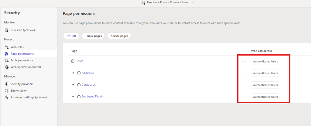 - Here, I am also changing “Page Permissions” of all the pages as “Authenticated users”.