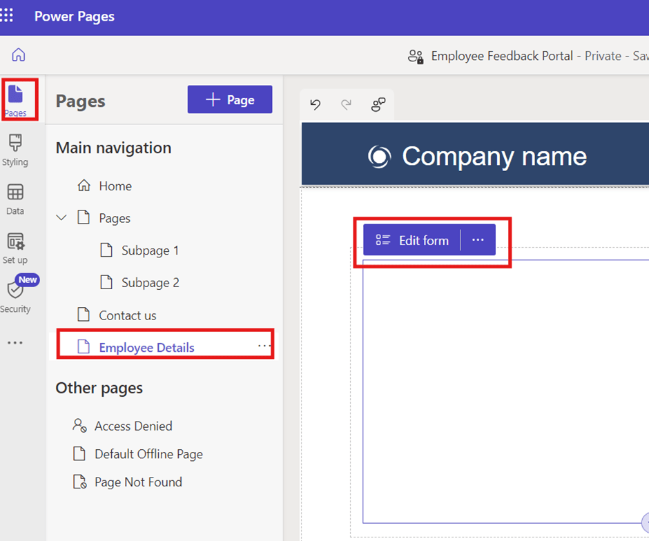 - Now, Click on Pages from the left navigation >> Select the page where you have added a Form component >> Click on “Edit Form”
