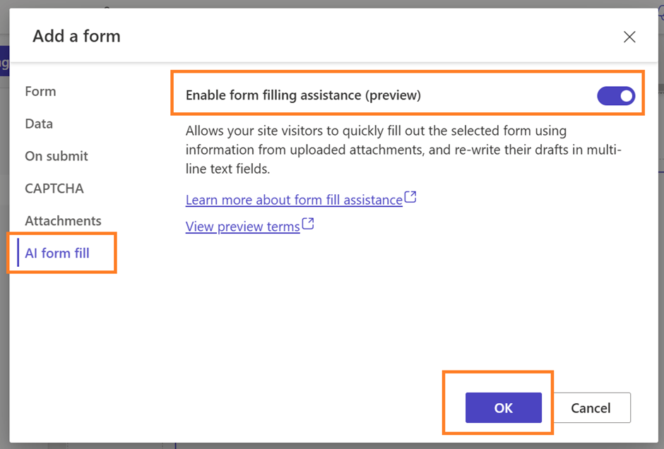 - Now, go to the last option “AI form fill”, enable the toggle button there and click on “OK” to see the magic of AI.