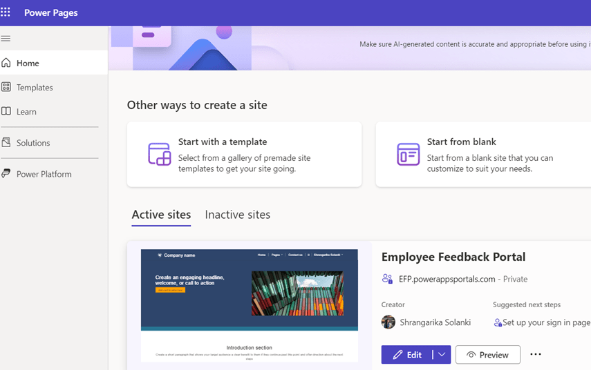 - Navigate to Power Pages Design Studio and select your site from “Active Sites” and click on Edit.