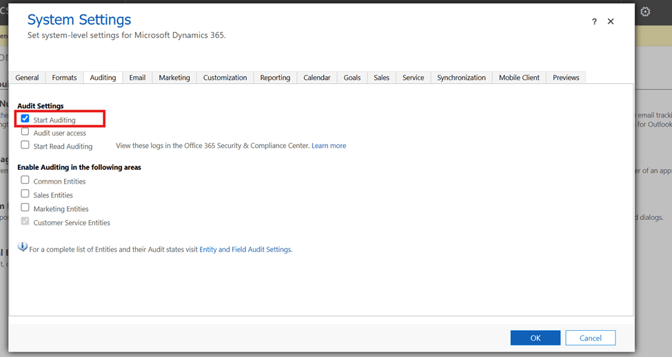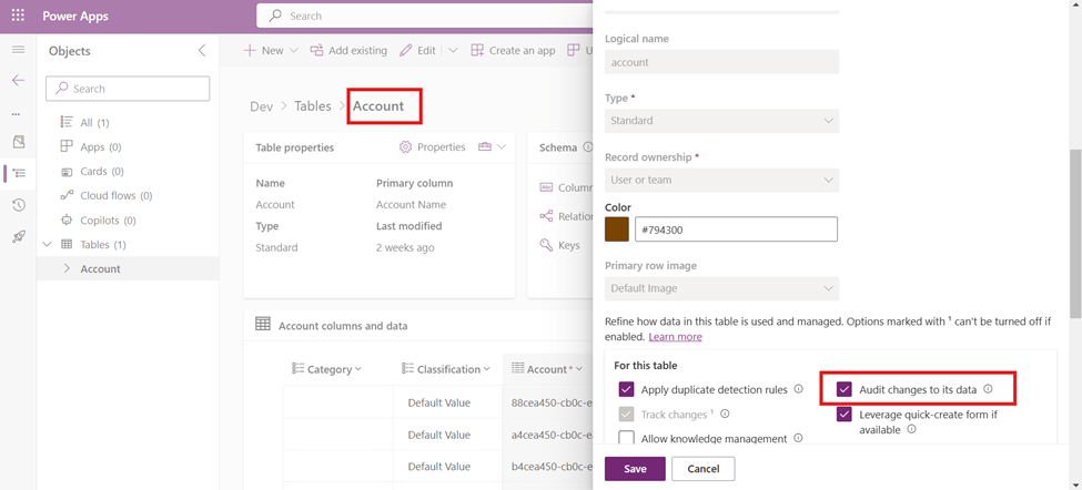 - Next, go to the properties of the Account table and enable auditing for the entity by enabling checkbox for “Audit changes to its data”.