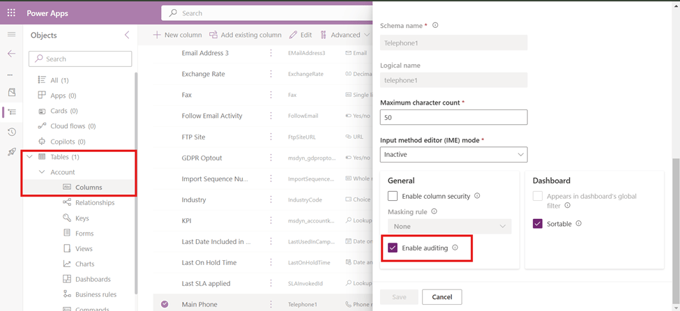 - Next, enable auditing for the columns you want to track. For that, select the column and enable the checkbox for “Enable Auditing”