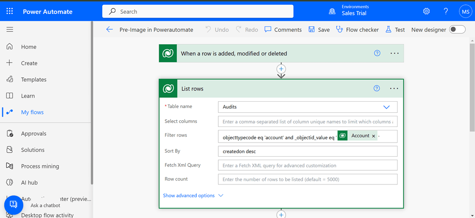 - Add a new action called List records of the Dataverse connector and select the Account table, in the Filter Query, input a filter to fetch the relevant audit logs for the updated record. For instance, you can filter by the target table’s ID and event type (for updates)
