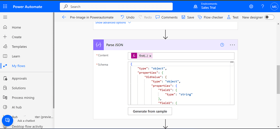 - Add Parse JSON action and in content add expression first(outputs(‘List_rows’)?[‘body’]?[‘value’])?[‘changedata’]