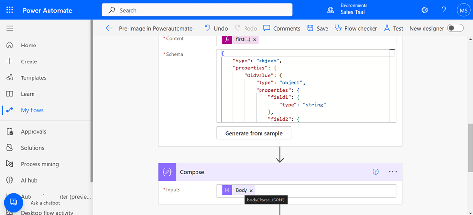 - Now by using this expression we can get the old/previous value @{outputs(‘Compose’)?[‘changedAttributes’][0][‘OldValue’]}