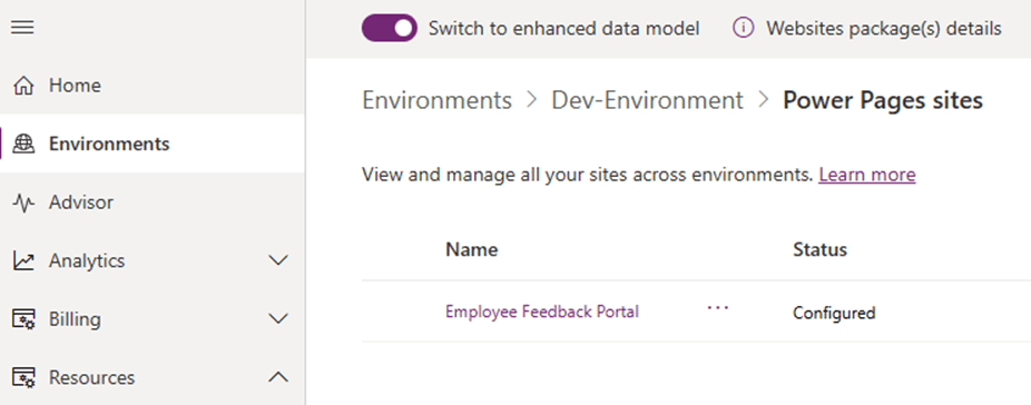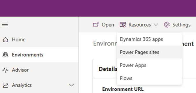 - Click on Environments >> Select your desired environment >> Resources >> Power Pages Sites