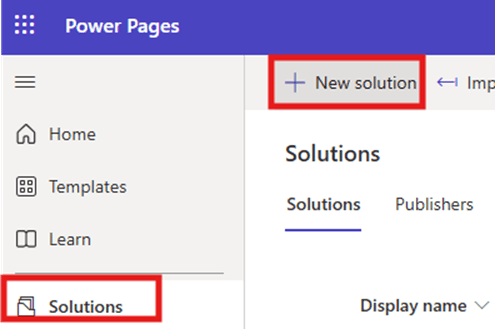 - Click on Solutions >> + New Solution >> Give required information to create a solution and click on Create. (You also may select an existing solution if already created)