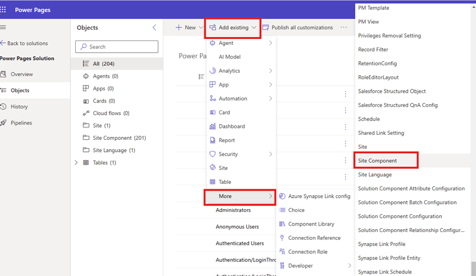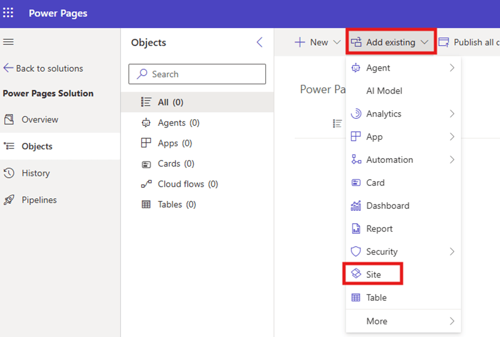 - Let’s first add “Power Pages Site” into the solution. Click on Add Existing >> Site
