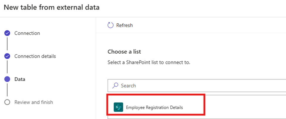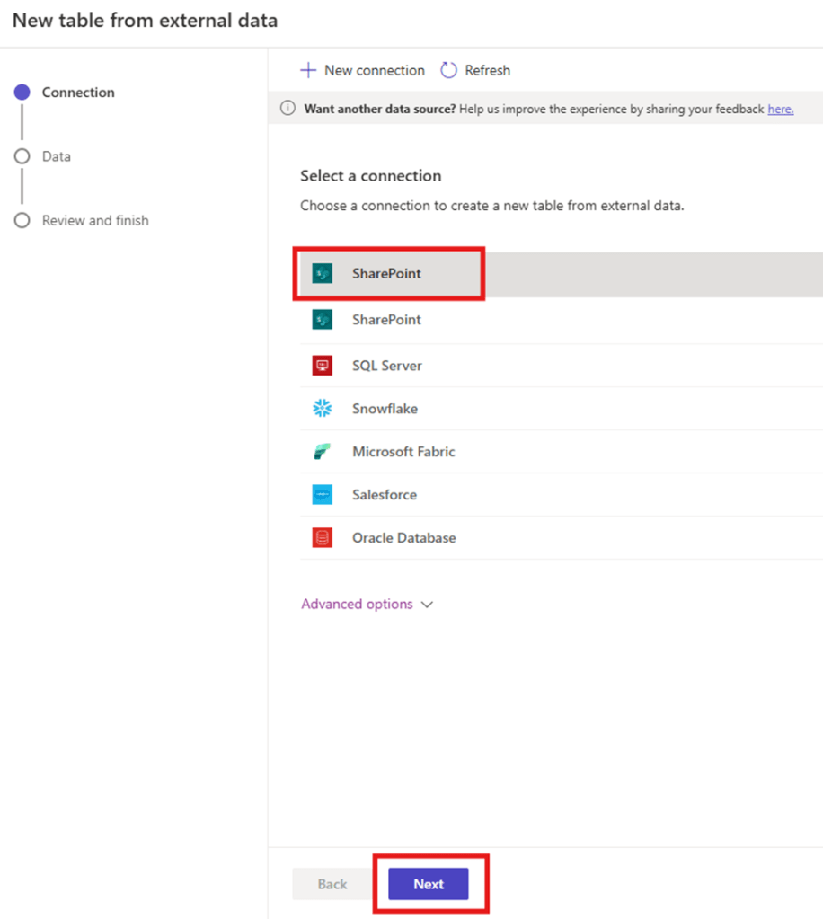 - You now will see the SharePoint Connection in the list. Select that and click on “Next”