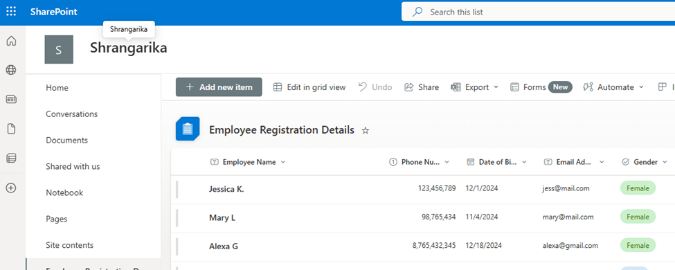 - Make sure you have a SharePoint list already created with proper data. Here I have one SharePoint list which I am going to use in this example.