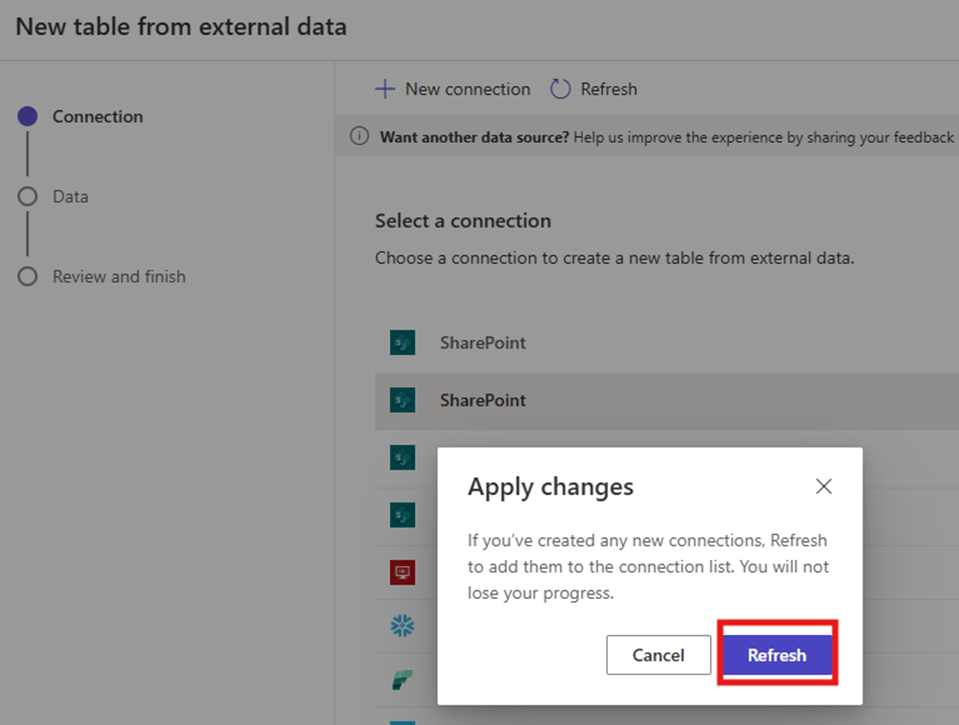 - Select a connection, in this example, we will use SharePoint as external Data Source. Click on +New Connection