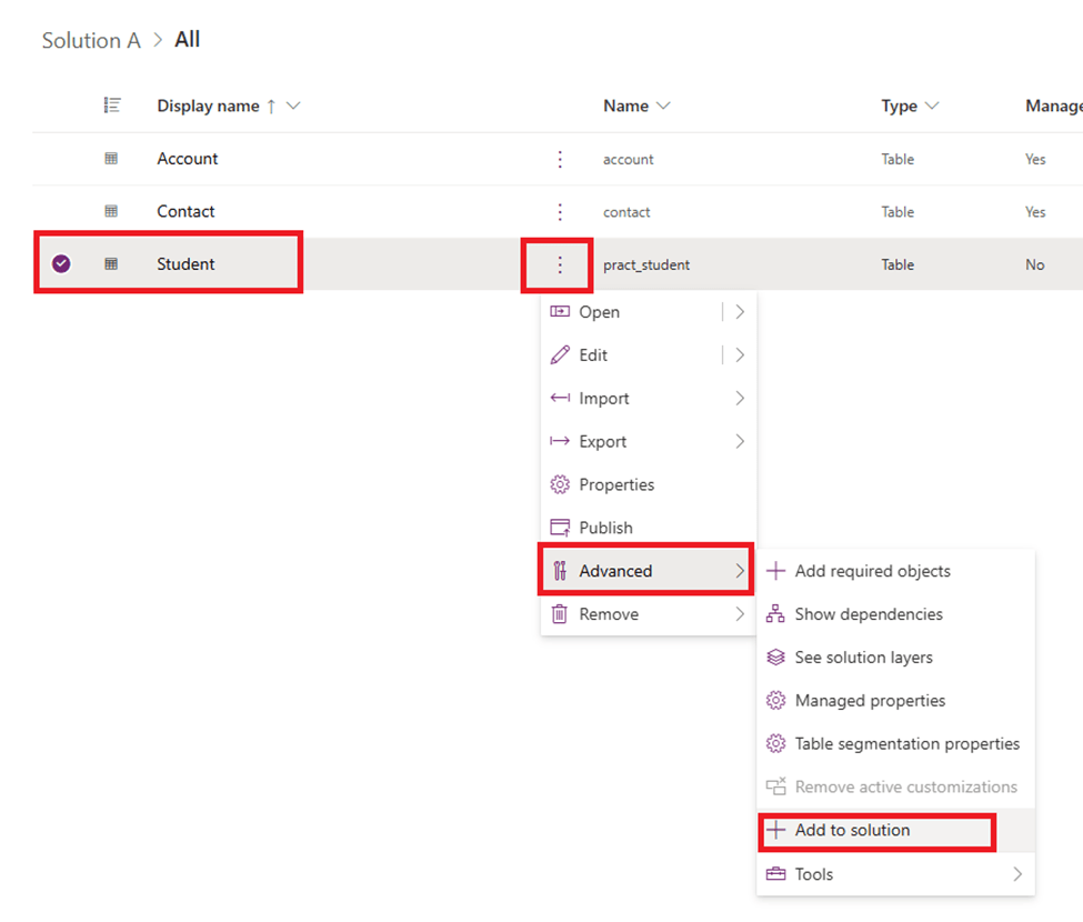 - Select “Student” table, click on three dots then Advanced and then + Add to Solution