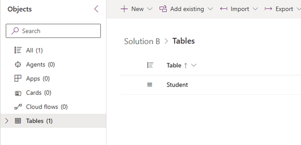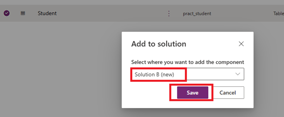 Note: Initially, I added the Student table to Solution A, including all associated objects. However, out of curiosity, I later removed the Student table from both solutions. Then, I re-added the Student table to Solution A without including any objects and repeated the process: selected the table → clicked on the three dots → Advanced → Add to Solution → selected Solution B → Save. Upon checking Solution B, I found that all objects related to the Student table had been added automatically.