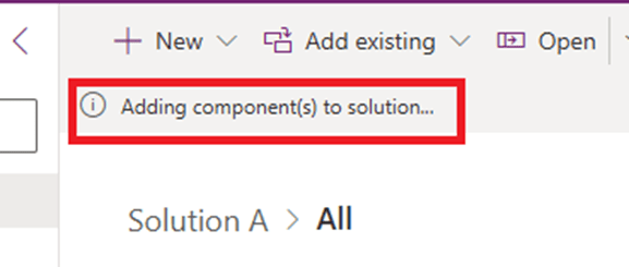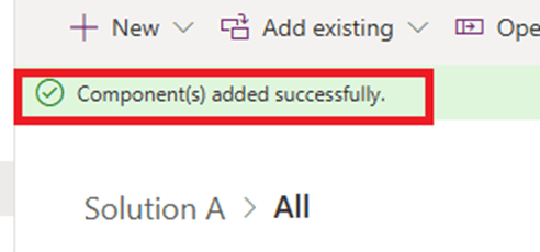 - And once, respective component will be successfully added to the solution, notification message will be updated to “Components added successfully.”