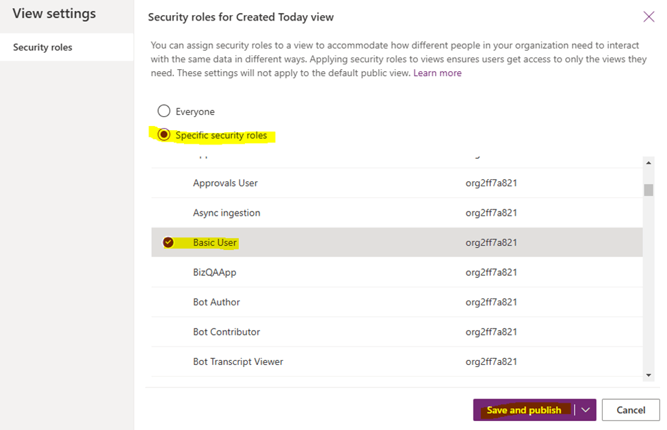 - You can see it is set to “Everyone”, Turn the checkbox for “Specific Security Roles” and select the required security role from the list. Save and publish the changes.