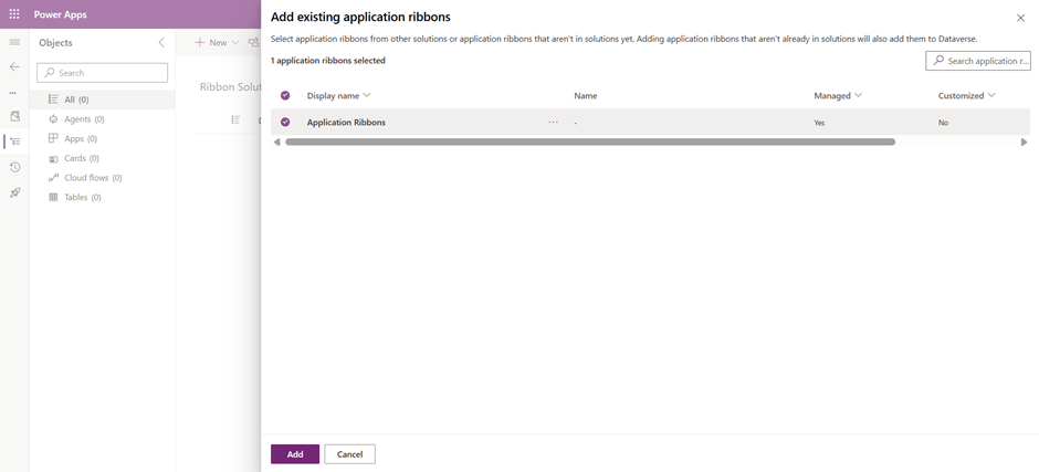 - Navigate to Ribbon Workbench and Select the previously created solution.