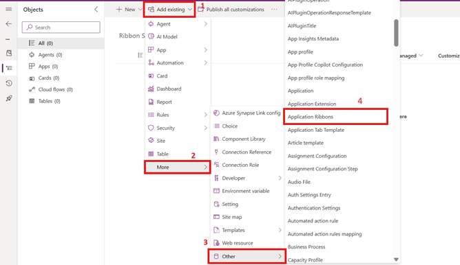 - Add Application Ribbon into solution by following steps in below image – Add Existing >> More >> Other >> Application Ribbon >> Publish All Customisations